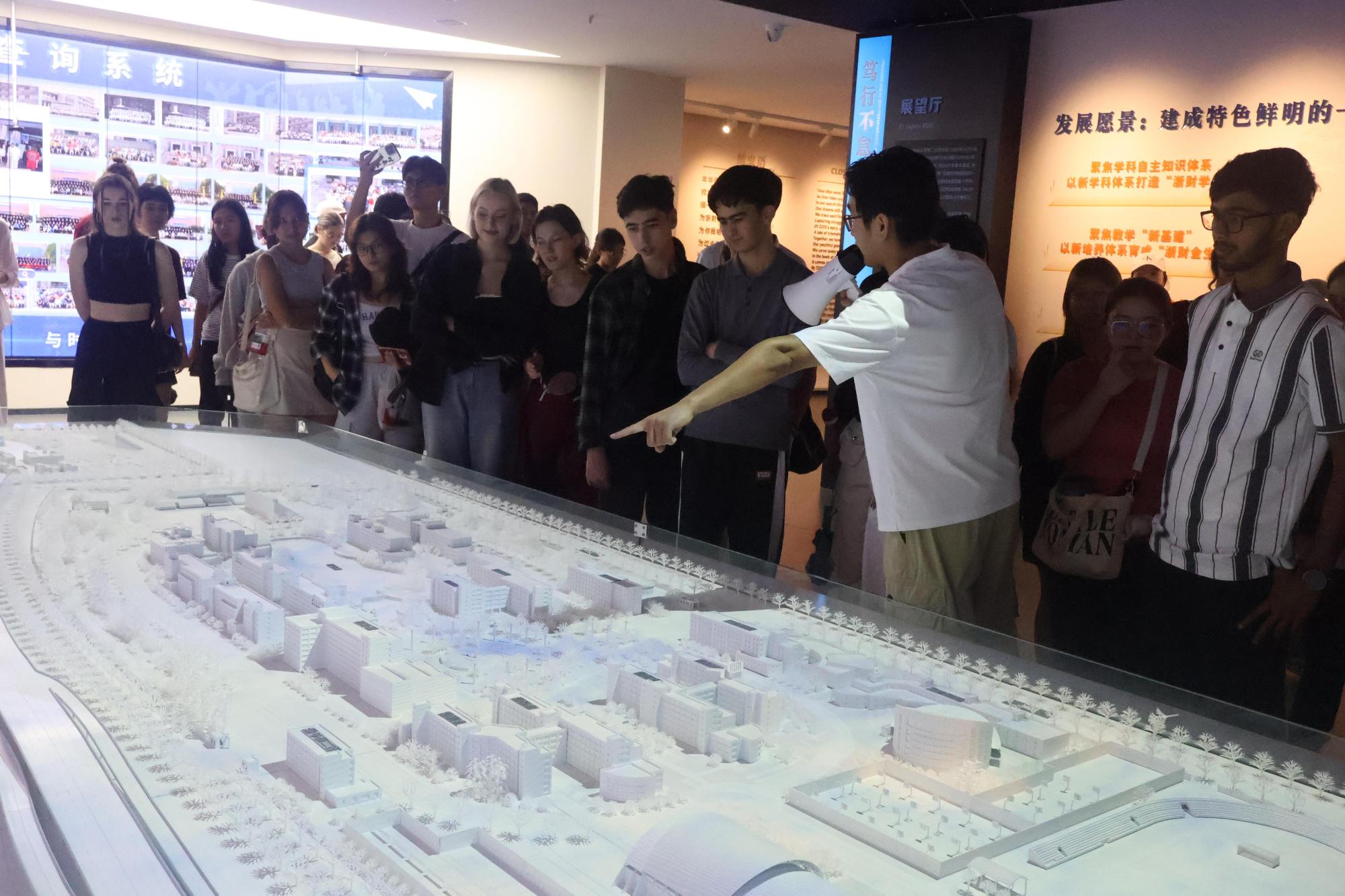 跟随志愿者的脚步,同学们的目光被墙上一张张珍贵的老照片和展柜中泛黄的历史实物所吸引。从1974年建校初期的创业维艰,到不同历史时期的跨越发展,国际学生们静静地聆听着学校的创办故事与发展历程,深刻体会到“筚路蓝缕”的真正含义